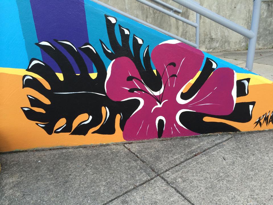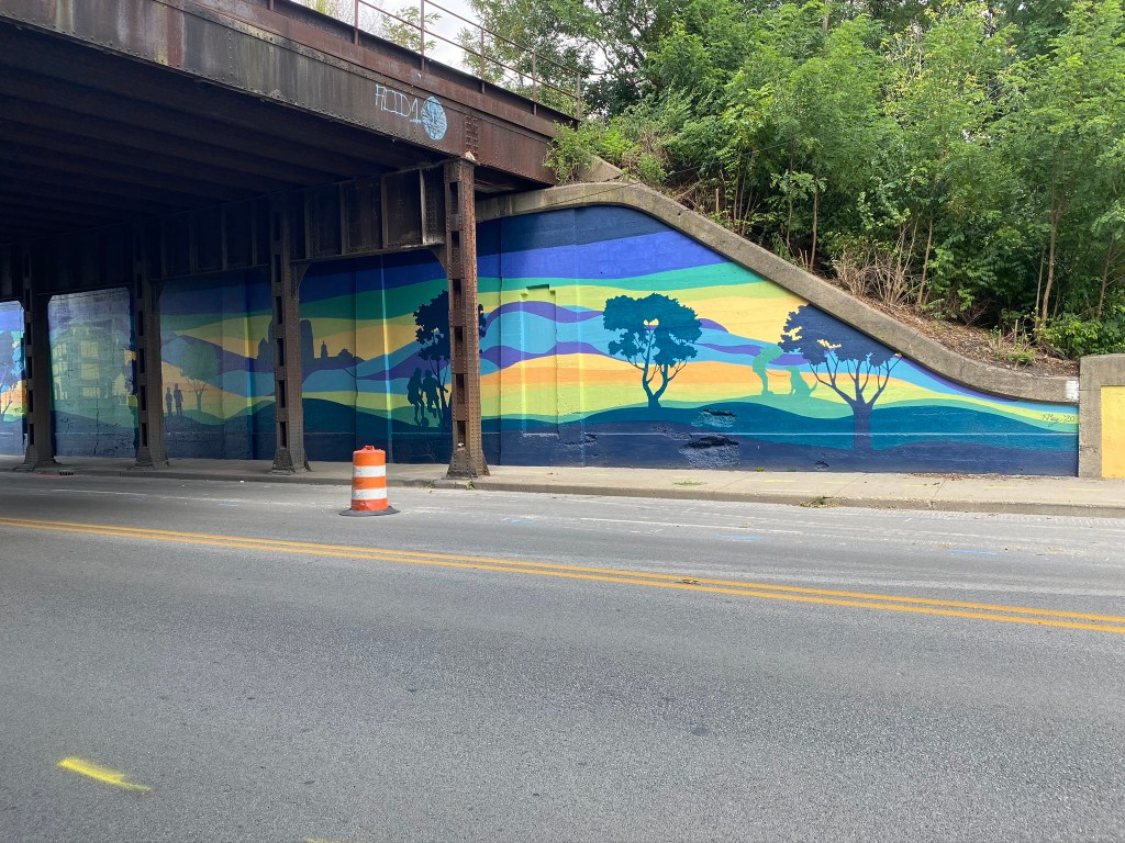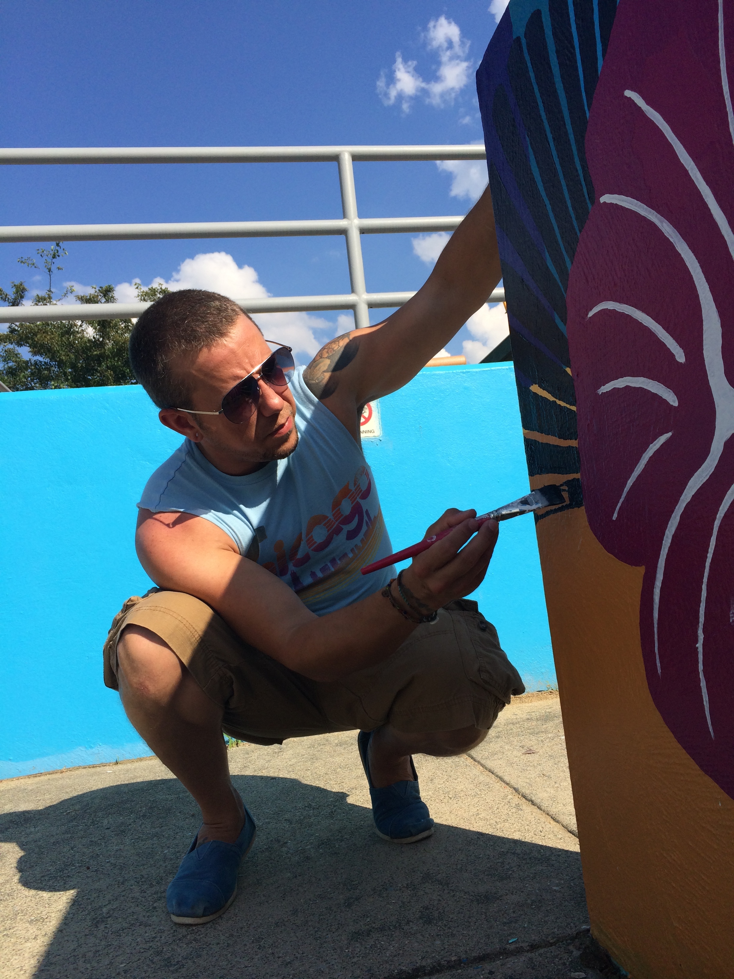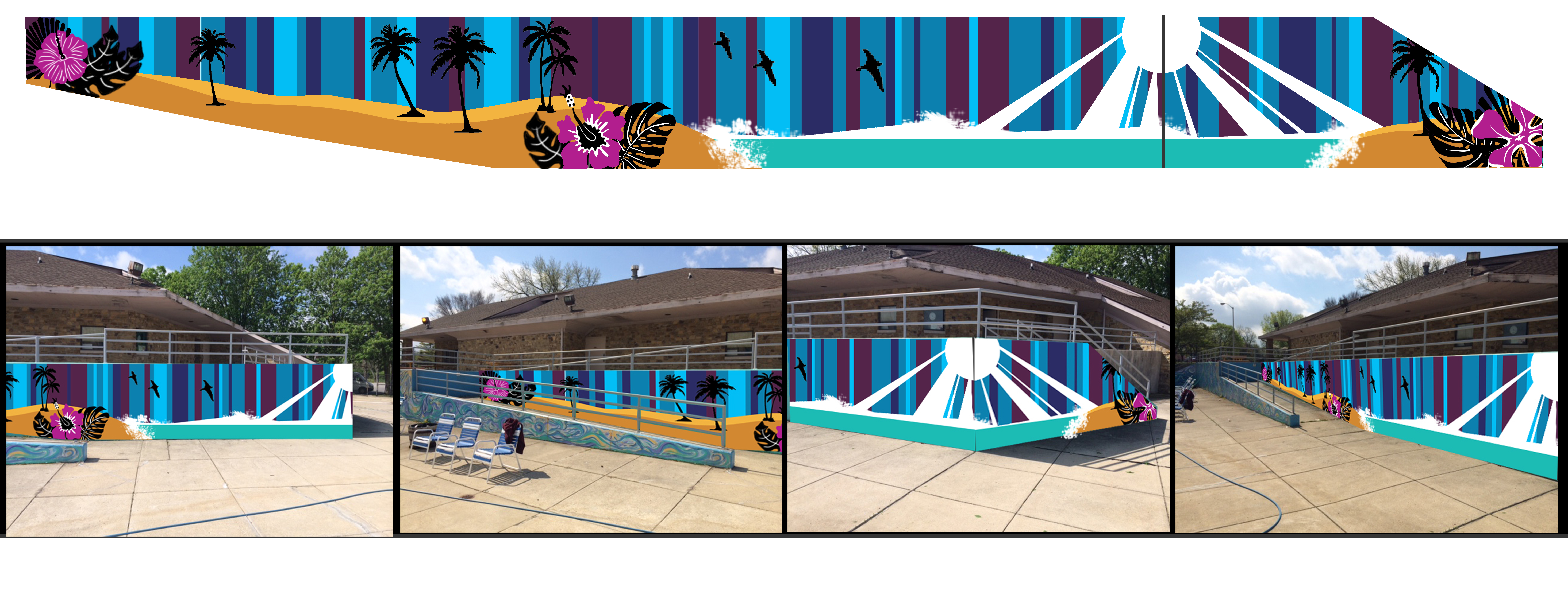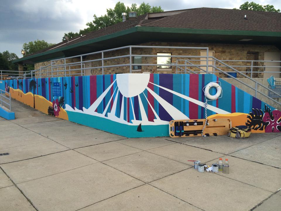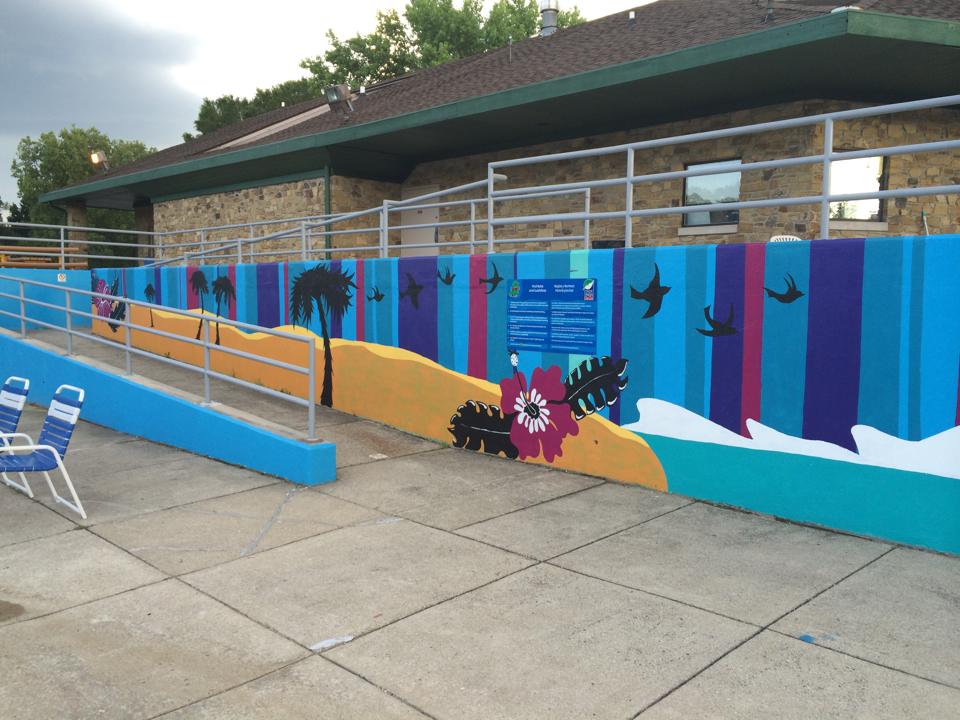 The concrete walls at the Broad Ripple Pool were uninviting and bland. Indy Parks reached out to Kris to create a mural that added some color and a tropical flare to the pool side.