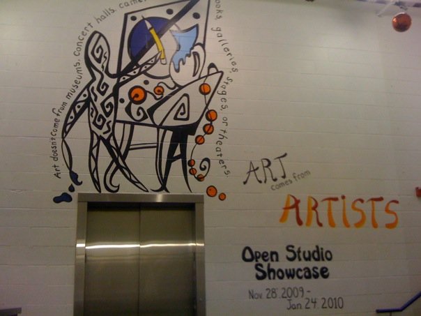From 2009-2012 Kris worked as an Arts Specialist and later the Assistant Manager at the Garfield Park Arts Center. During that time, the exhibits in the main gallery rotated on a bi-monthly basis. Kris painted a new mural over the elevator in the GPAC lobby for each exhibit for over a year, until a decision was made to create a simple GPAC welcome mural. A few years after Kris moved on, the manager of GPAC contacted him to create a new logo and branding for the center. In 2018, the center reached out to have Kris create a new, permanent installation in the lobby utilizing the new logo and creating a new welcome for visitors.
