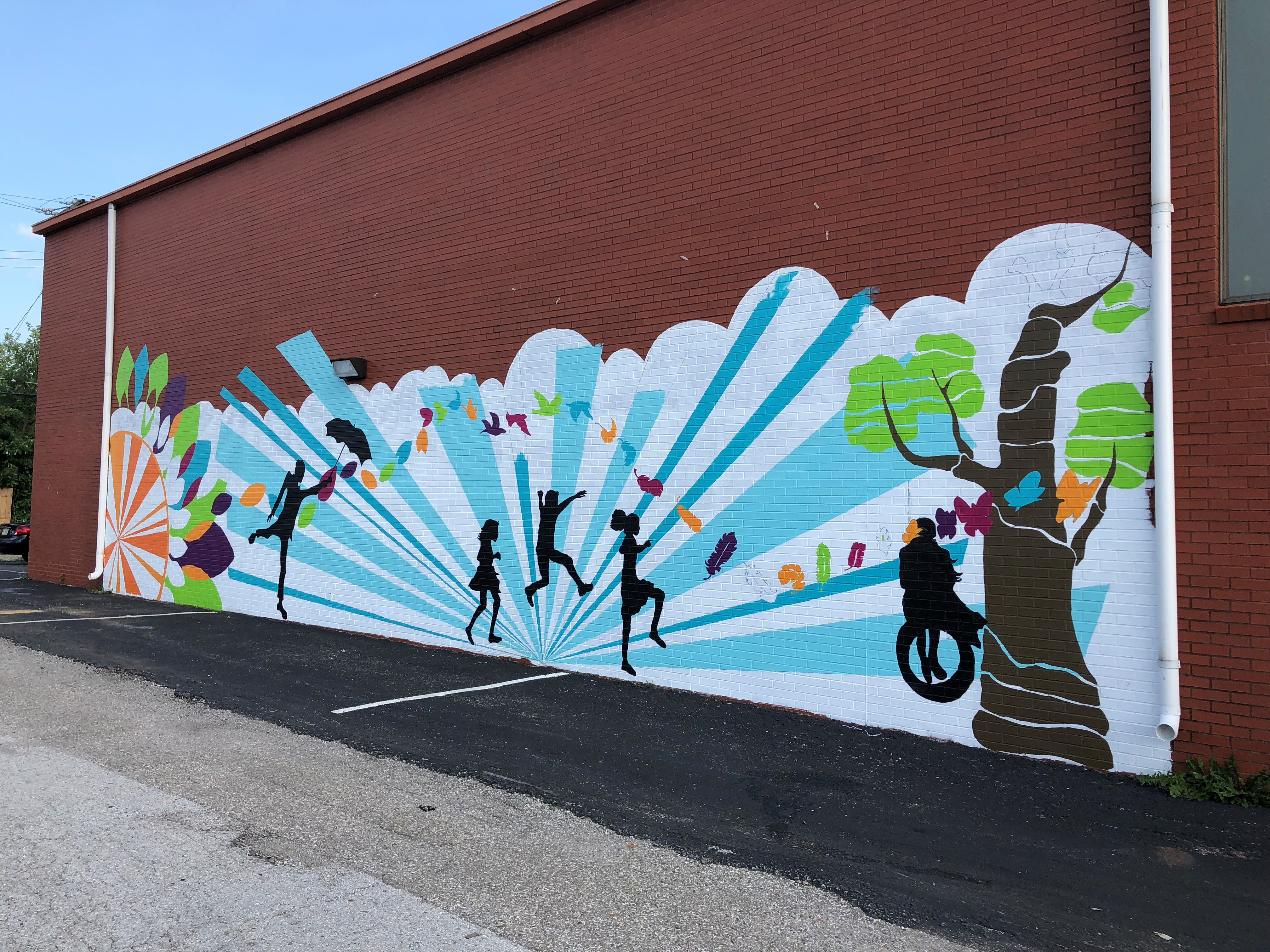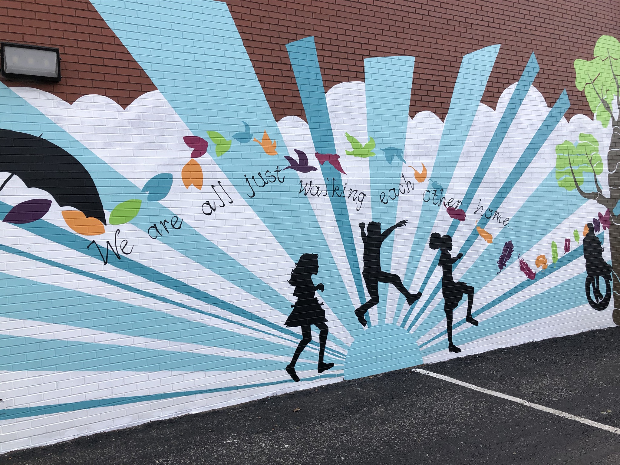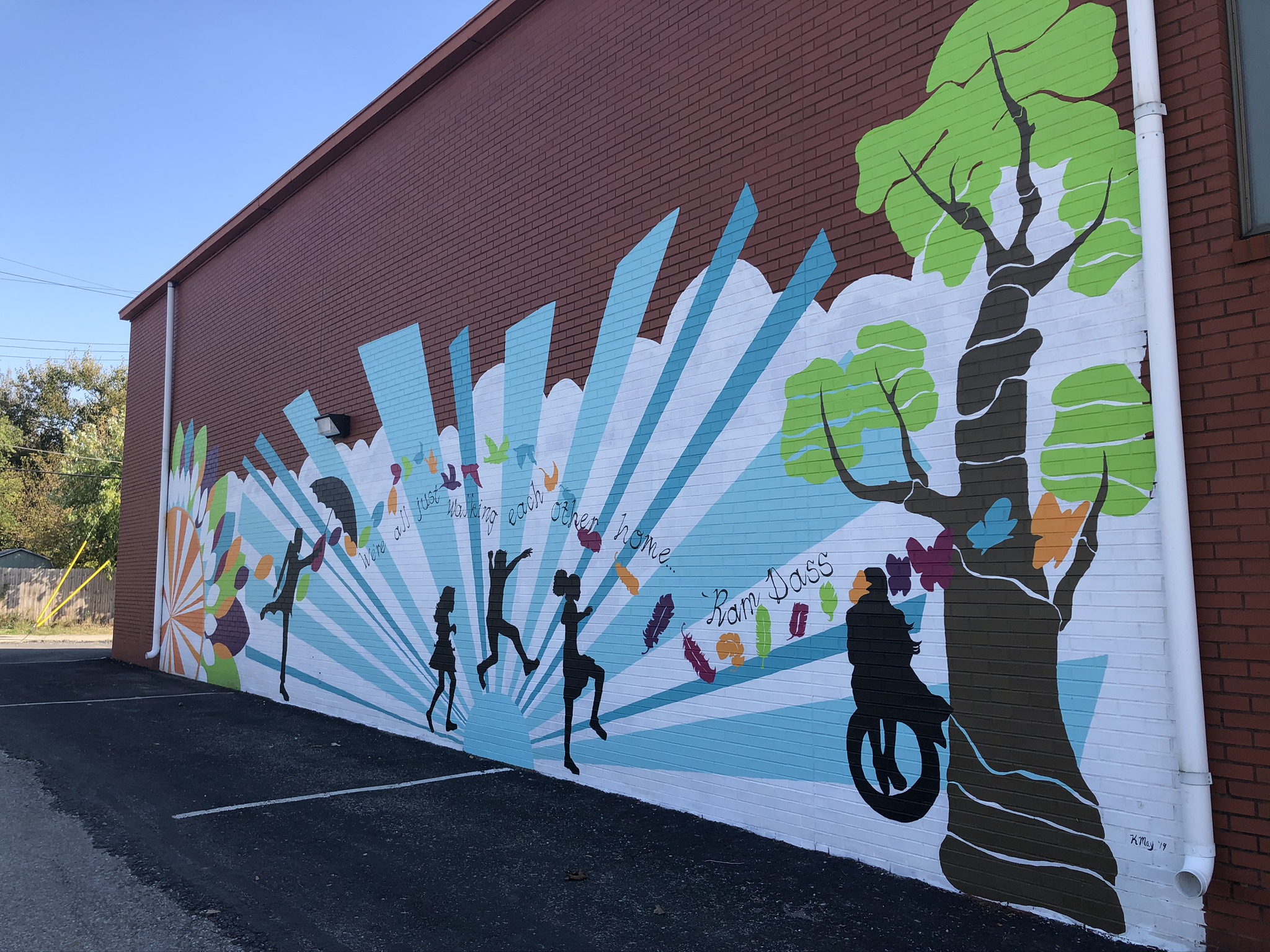 The Church Within is located in the heart of Historic Fountain Square on the south side of Downtown Indianapolis. Fountain Square is known for its arts and music culture, and the Church is active in both the visual and performing arts. To reflect this culture on the outside, the congregation determined that they would like to brighten the large brick walls facing the community. As inspiration, the chose a quote that is central to the church community: “We are all just walking each other home” by Ram Dass. Kris worked with the church members to come up with a design for two of the large walls, one that was just brick and the other that had a very old mural done by a girl scout troop many years ago. Church members were invited to help paint portions of the mural, building upon the community service that the church proudly engages in.