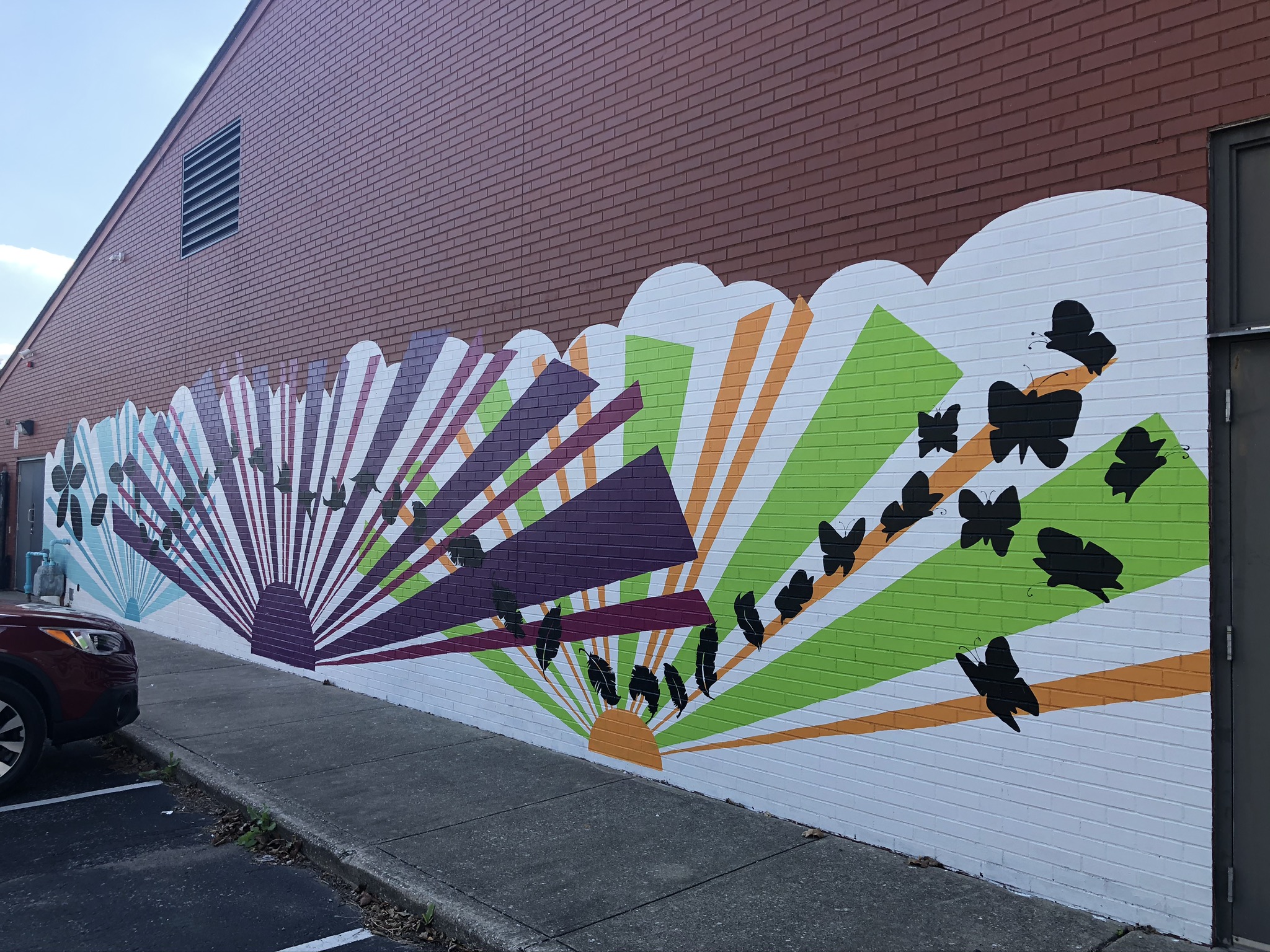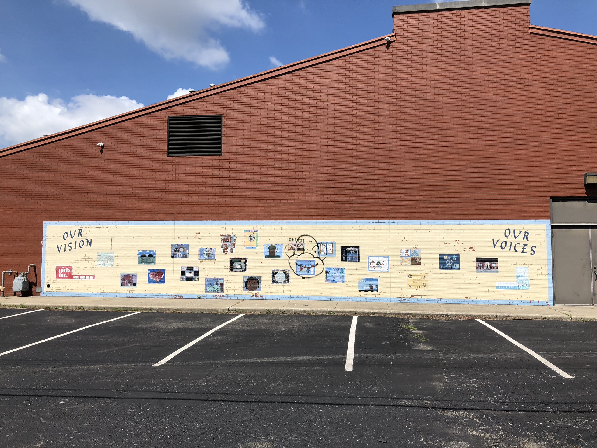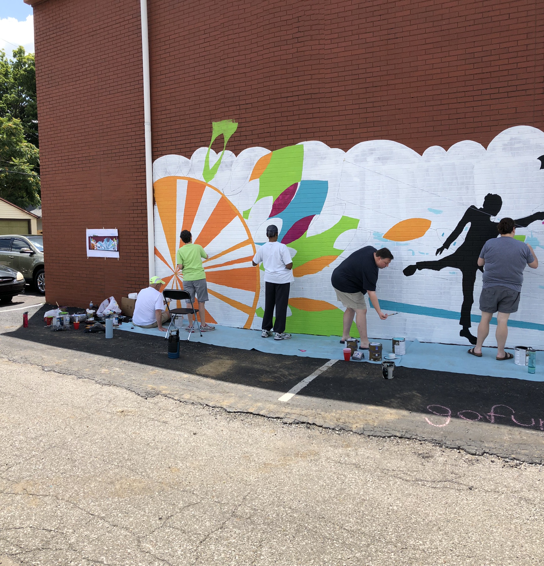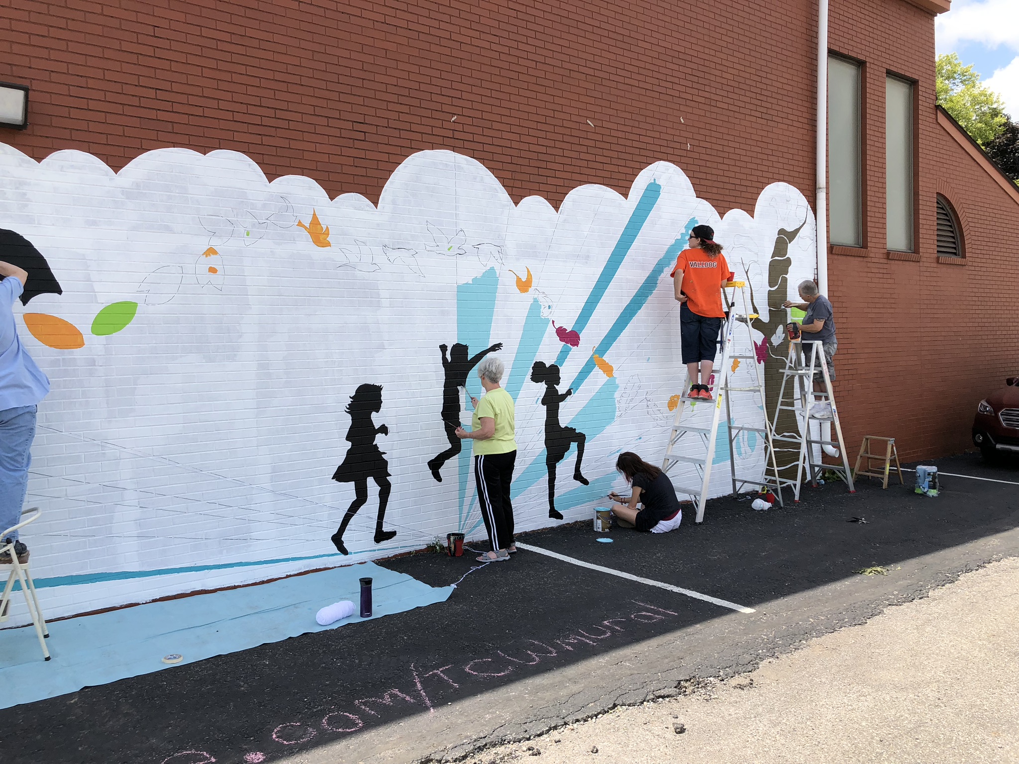 The Church Within is located in the heart of Historic Fountain Square on the south side of Downtown Indianapolis. Fountain Square is known for its arts and music culture, and the Church is active in both the visual and performing arts. To reflect this culture on the outside, the congregation determined that they would like to brighten the large brick walls facing the community. As inspiration, the chose a quote that is central to the church community: “We are all just walking each other home” by Ram Dass. Kris worked with the church members to come up with a design for two of the large walls, one that was just brick and the other that had a very old mural done by a girl scout troop many years ago. Church members were invited to help paint portions of the mural, building upon the community service that the church proudly engages in.